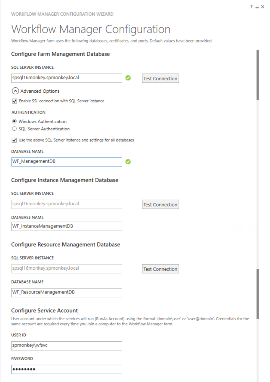 Enter the SQL Server instance name, select SSL checkbox to enable SSL communication, and other information on the Workflow Manager Configuration screen.