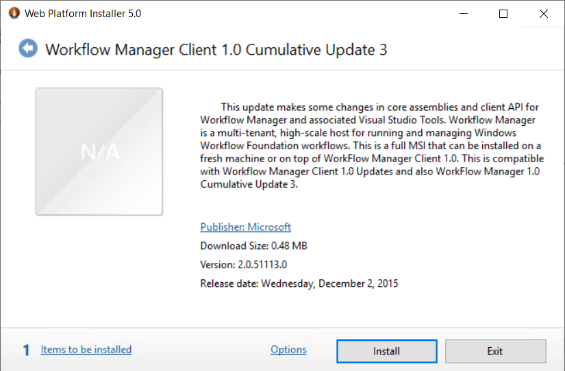 - Workflow Manager 1.0 for existing installs only – Use Workflow Manager 1.0 Refresh (CU2) for new installs.