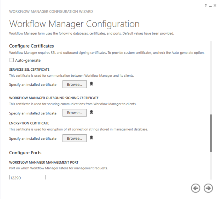 After completing the SSL enrollment for the Workflow server, open the Workflow Manager Configuration from the Start menu. Select “Configure Workflow Manager with Custom Settings”